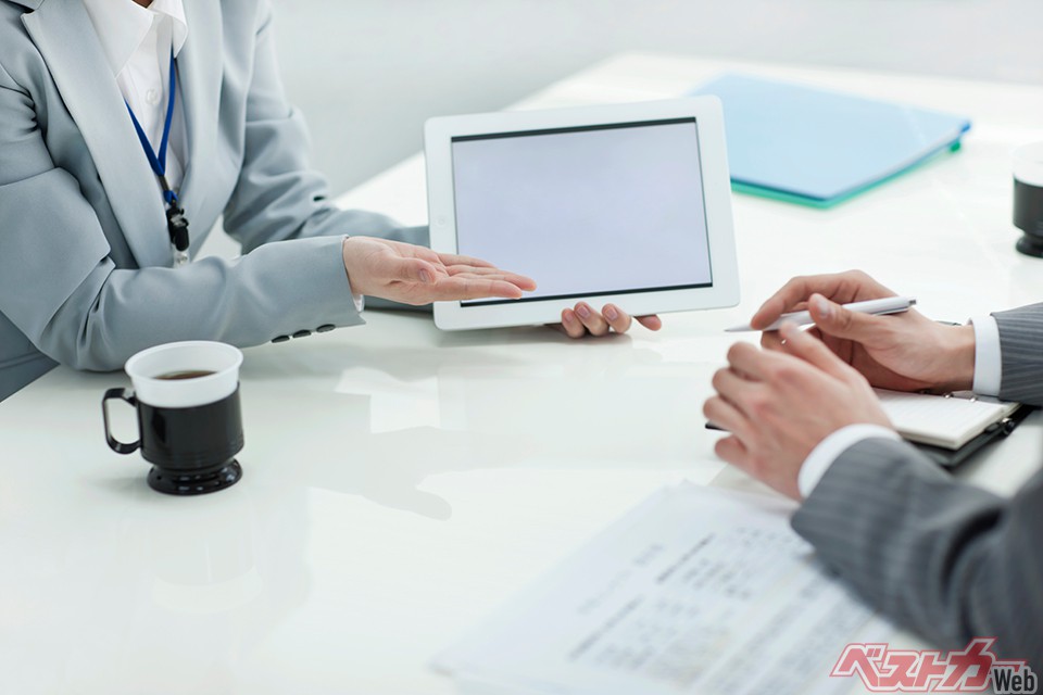 展示車両の案内をする時は紙カタログではなく、片手にタブレットを持ち、即座に細かな車両データを検索するのが、今のショールーム営業スタイルだ。