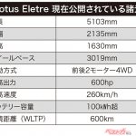 全長5m超、全幅2m超、ホイールベース3m超と従来のロータスのイメージを覆す大型ボディに100kWhを超えるバッテリーを搭載、最大600hpのハイパワー4WDシステムだ。