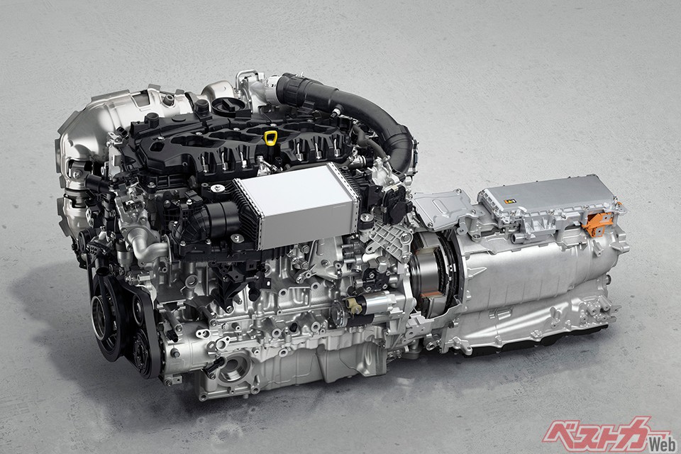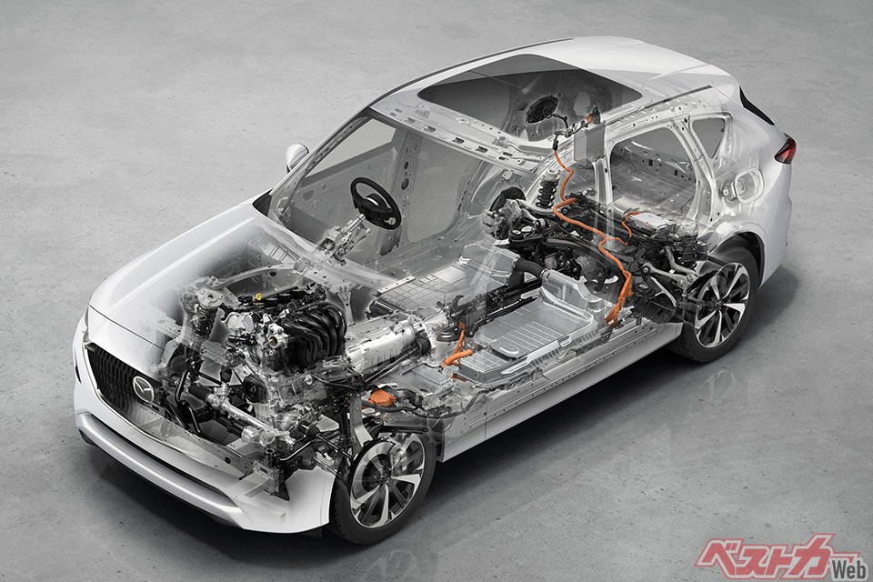 4気筒PHEVのベースエンジンは、CX-5などにも使われている2.5L直4NAエンジンだ。わりとなんの変哲もないエンジンと言っていい。