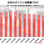 ハイブリッドをはじめとする電動車の登場や、ユーザーの環境意識の高まりなどもあり、クルマの燃費が著しく改善され、またコロナの影響による物流の混乱や旅行の減少などもあり、直近ガソリンの消費量は大きく減ってきている。