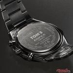 モータースポーツのクルマ作りに欠かせないカーボン素材を文字盤に使用し、TOM’Sのロゴや秒針、インダイアルの小針にゴールドカラーを施し、高級感を演出。6時の位置には排気熱で青く焼き色が入ったようなヒートグラデーションカラーを表現されている。