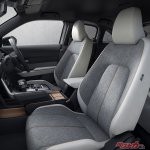 前述したように、インテリアに使われている素材はサステナブルな物がふんだんに使用されている。例えば、コンソールトレイとドアグリップには「ヘリテージコルク」が使用されている。樹木を伐採することなく樹皮を採取して生産されるコルクだが、MX-30ではさらに、コルク栓を生産した端材を使用。また、ドアトリムのアッパー部分は、原料にペットボトルのリサイクル原料を使用。従来の樹脂や革の表現とは異なり、物自体が空気を含んだかのような風合いに仕上がるのが特徴で、素材による開放感を表現している。