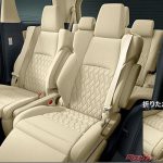 クラス初となるオットマン機構とシートヒーターに加え、折りたたみ式大型サイドテーブルなどを装備。3列目をサイド跳ね上げ式としたうえで、シートをいったん横にスライドさせることなく移動できる「ストレート超ロングスライド」(7人乗り、スライド量745mm)を実現した。