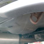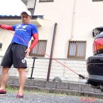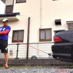 早速、チューブを牽引フックに固定したら、まずは、基本動作から。車体に対して身体を横向きに立ちながら、チューブを引っ張ります。内側の腕、そして外側の腕と両側やるといいでしょう。室内の家具やなんかと違い、これで車体が動くことはないので、かなり力を入れて引っ張っても大丈夫です。