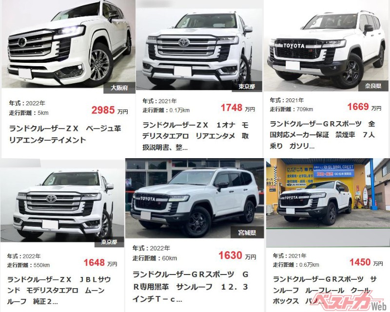 5月12日の業者オークションには6台の新型ランドクルーザーが出品され、最高額は2200万円で落札されていた。また大手中古車情報サイトには走行距離5kmの2985万円、総額3000万円というランドクルーザーZXをはじめ、6台も掲載されていた。