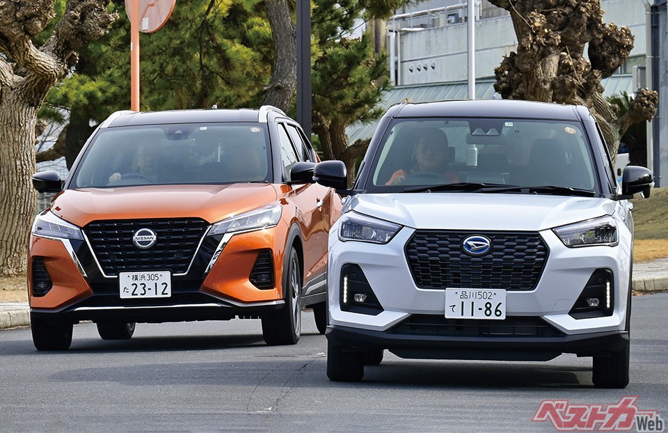 日産 キックス(左・オレンジ)とダイハツロッキー(右・白)。ロッキーは改良によりハンドリングが格段に進化しているが、まだまだキックスには及ばない