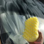 乾いたコンパウンドを水で洗い流すのには、スポンジで洗うことになる。これは洗車用のスポンジ、ソフト99「洗車スポンジPRO」を使ってみた。大きなスポンジで、ひょうたん型に中央がくびれていて握りやすい。