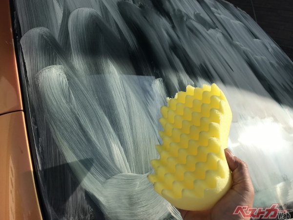 そのため従来から、油膜落としを併用するのが理想的な施工だったが、この油膜落としの作業が結構な重労働で、粘度の高いコンパウンドで広いフロントウインドウをゴシゴシ磨くのは、かなり疲れる作業だ。