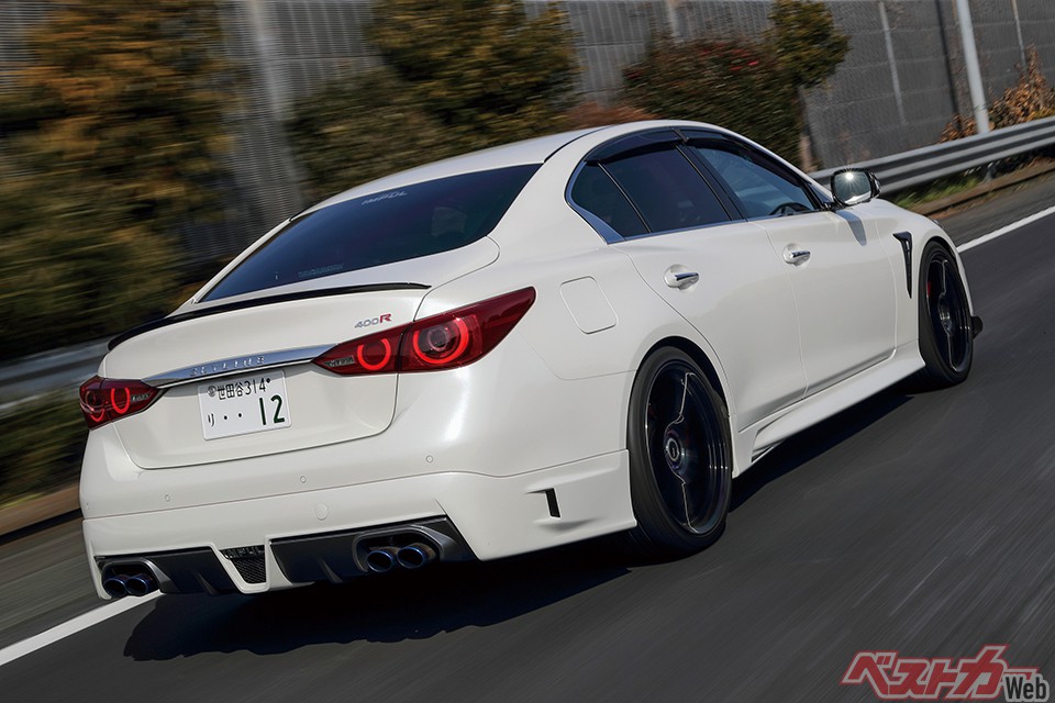 537Sのベースはスカイライン400Rだ。スカイライン史上初となる400psを超えた405ps。新世代VR型ユニットは3L、V6ツインターボなのはご存知のとおり。